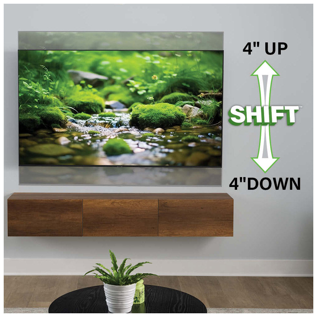 With the 4D™ + SHIFT height adjustment feature, you can enjoy up to 8 inches of up or down movement for precision TV positioning on the wall , making this mount an ideal solution for when mounting a TV above a fireplace mantle, above a TV console, or even when you have to position around a pre-existing outlet on the wall. This SHIFT feature also allows you to raise your TV at a later time to provide enough space to add in a soundbar or, accommodate seasonal decorations that may interfere with the screen of the TV.